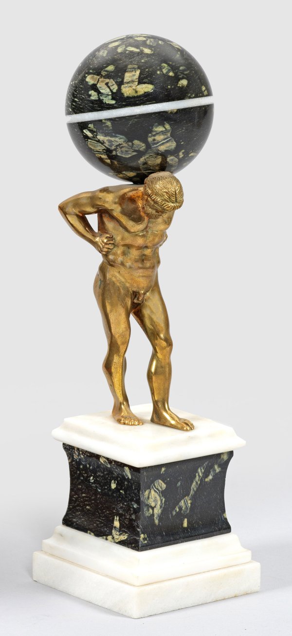 Italian sculptor active 19th/20th century. Gilt bronze and marble figure of Atlas supporting a terrestrial globe. Grand Tour souvenir.
