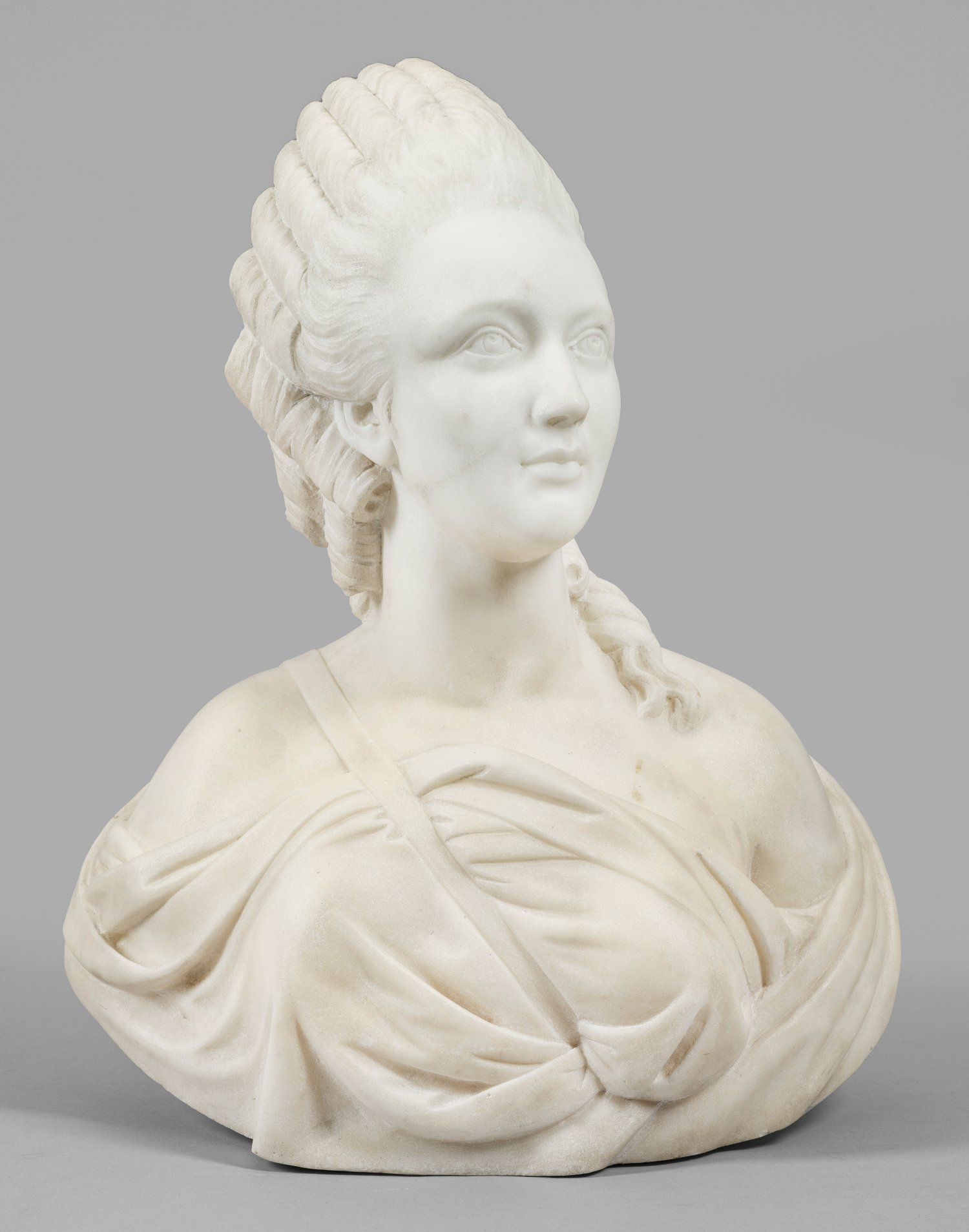Weißer Carrara-Marmor. Darstellung mit kunstvoller Frisur nach rechts gewandt, bekleidet mit freien Schultern. Madame du Barry (1743 - 1793) wurde als Marie-Jeanne Bécu geboren und stammte aus bescheidenen Verhältnissen. 1768/69 lernte sie König Ludwig XV. von Frankreich kennen und wurde nach der bürgerlichen Madame de Pompadour (1721 - 1764) schnell als skandalumwitterte Mätresse seine Favoritin (nach ihrer überstürzten Heirat erhielt sie 1768 den Titel "Comtesse"). Der König erbaute für sie das Schloss Louveciennes, wohin sie sich nach dem Tod des Herrschers im Jahr 1774 zurückzog. Pajou wurde ihr Lieblingskünstler und 1770-1773 gab die Comtesse fünf Büsten mit variierenden Frisuren in Auftrag. Das vorliegende Exemplar ist eine im 20. Jh. entstandene Kopie-Variante der letzten dieser Büsten, die sich heute im Louvre befindet und im Salon von 1773 einen Triumph feierte. Die Comtesse du Barry wurde im Jahr 1793, während der Französischen Revolution, verhaftet und hingerichtet. H. 49 cm.