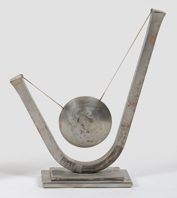 Edelstahl, partiell gebogen, gebürstet und poliert, um 1990. Aus mehreren Teilen gefertigte, bewegliche Skulptur mit gongartig an einem Bogen aufgehängtem Diskuselement. Teusch, der in Paris Architektur studierte und zehn Jahre auf diesem Gebiet gearbeitet hatte, wandte sich mit 35 Jahren der Malerei und Bildhauerei zu. 1975-1980 studierte er an der Städelschule in Frankfurt am Main, befreundet sich in dieser Zeit mit Joseph Beuys. Er wurde in Köln ansässig und hatte seit 1983 zahlreiche Einzelausstellungen im In- und Ausland; Anfang der 2000er Jahre ging Teusch nach Marbella in Spanien. Seine Skulpturen fertigte er mit Vorliebe als objets trouvés. 45,5 cm x 38,5 cm x 10,5 cm.