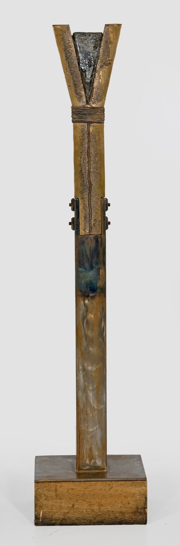 Unikat-Skulptur. Bronze, Stahl u. Eisen auf Holzsockel, teilw. patiniert u. geschwärzt. Sign.; Der Schweizer Künstler besuchte die Kunstgewerbeschule Zürich und studierte an der Académie de la Grande Chaumière in Paris bei Ossip Zadkine. Seit 1967 war Bucher nur noch als Bildhauer tätig, ab 1976 schuf er auch Kunstwerke, die flüssige Lava enthielten, wozu er selbst Vulkane bestieg, um die vorbereiteten Werke direkt vor Ort weiter mit Lava zu bearbeiten. Zahlreiche Arbeiten Buchers befinden sich im öffentlichen Raum, darunter die Skulptur "Die Gerechtigkeit" im deutschen Bundesverfassungsgericht in Karlsruhe (abgebildet auch 2001 auf einer Gedenkbriefmarke "50 Jahre Bundesverfassungsgericht"). Ca. 159,5 cm x 36,2 cm x 23 cm.