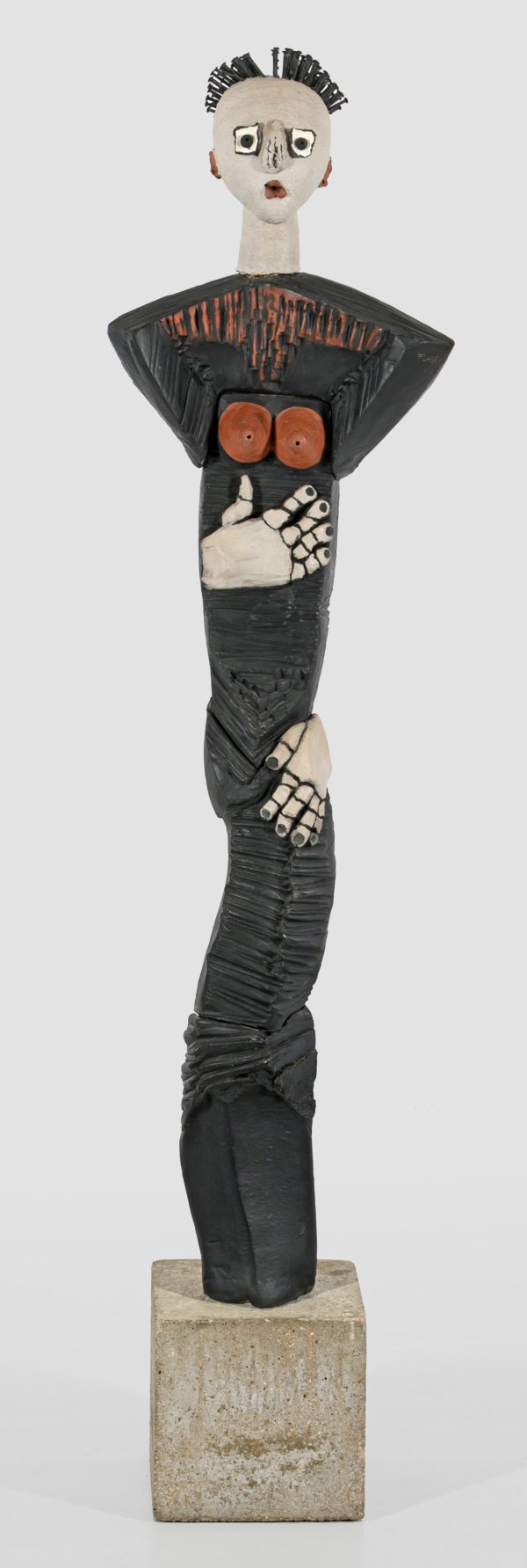 Mehrteilige Unikat-Skulptur. Mixed media (Keramik, Stahlnägel auf Betonsockel), partiell schwarz, weiß und rot farbig bemalt. Sign. u. dat. 1998. Stelenartig stilisierte Frau in langem schwarzen Kleid mit überdimensional großen Händen und durch rote Bemalung hervorgehobenen Brüsten, die Lippen rot geschminkt, die kurzen, stachelartigen Haare aus Nägeln gebildet. Carrasco studierte an der Schule für angewandte Kunst in Paris und arbeitete seit 1971 als selbstständige Keramikerin, insbesondere mit Steingut, Steinzeug, Raku und Terrakotta. Unermüdlich untersucht sie die menschliche Figur und verzerrt ihr Erscheinungsbild auf subtile Weise, um ihre auffälligsten Merkmale hervorzuheben. Werke der Künstlerin befinden sich u. a. in der Collection du musée national de Céramique, Sévres. Ges.-H. 170,5 cm.
