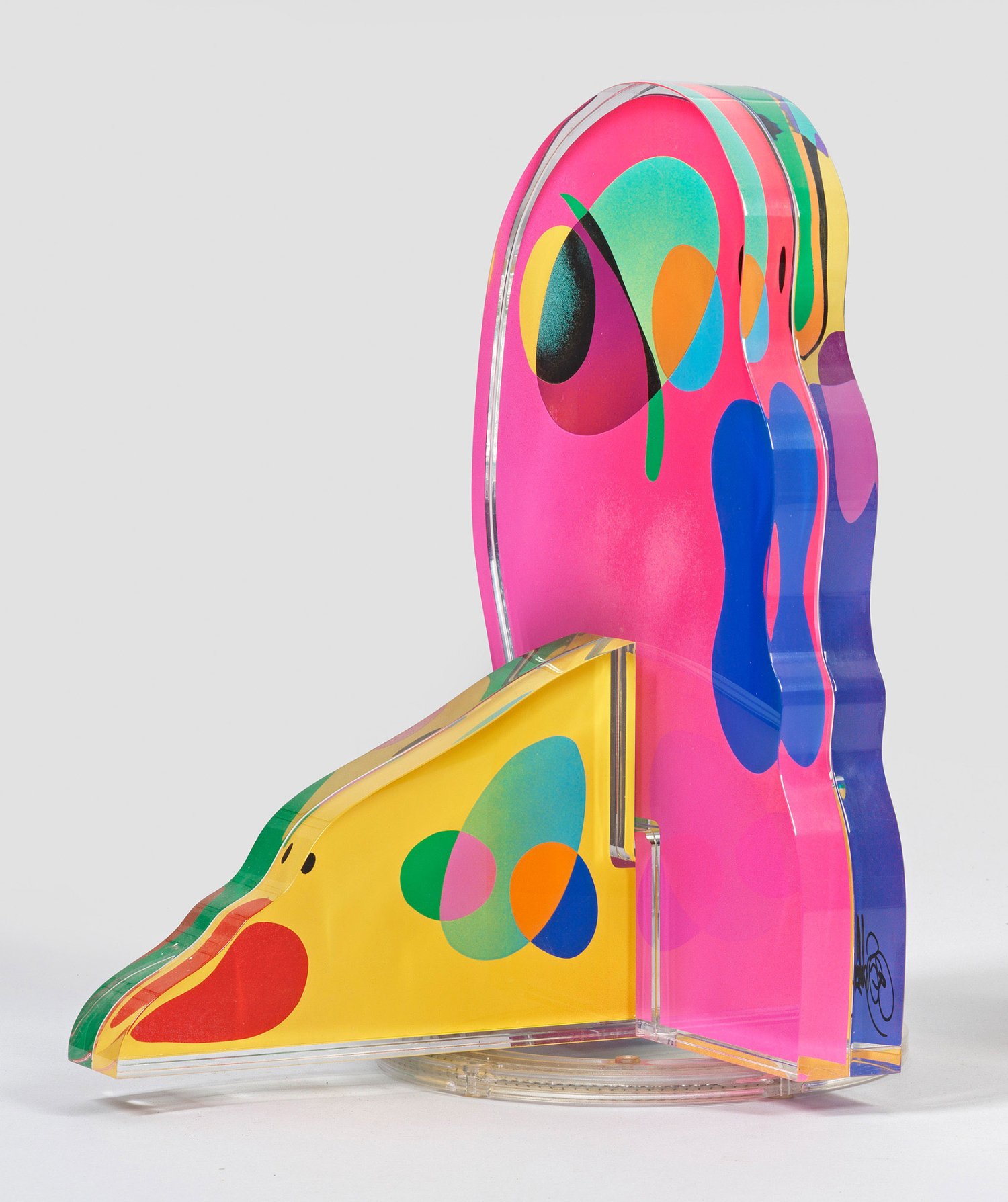 2-tlg., ineinander steckbare, asymmetrische Plastik aus jeweils miteinander verbundenen, dicken, farblosen Acrylglasplatten mit unterschiedlichem, polychromem, gesichtsartigem Bilddekor (wohl in Farbserigraphie-Technik). Sign.; Aufstellbar auf einem kugelgelagerten, farblosen Kunststoffreifen-Sockel. Ges.-H. ca. 41,5 cm.