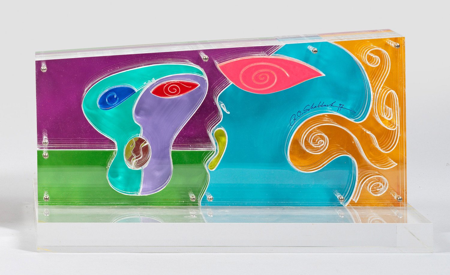 Acryl. Vielteilige Plastik aus fünf miteinander verschraubten, dicken, farblosen Acrylglasplatten, jeweils mit stilisiertem, polychromem, gesichtsartigem Bilddekor (wohl in Farbserigraphie-Technik) und kleinen, puzzleartig variabel ineinander steckbaren bzw. austauschbaren Gesichtspartien, Augen und Mündern. Sign. und dat. (19)97. Aufstellbar auf farblosem Acrylglassockel. Ges.-H. ca. 21 cm.