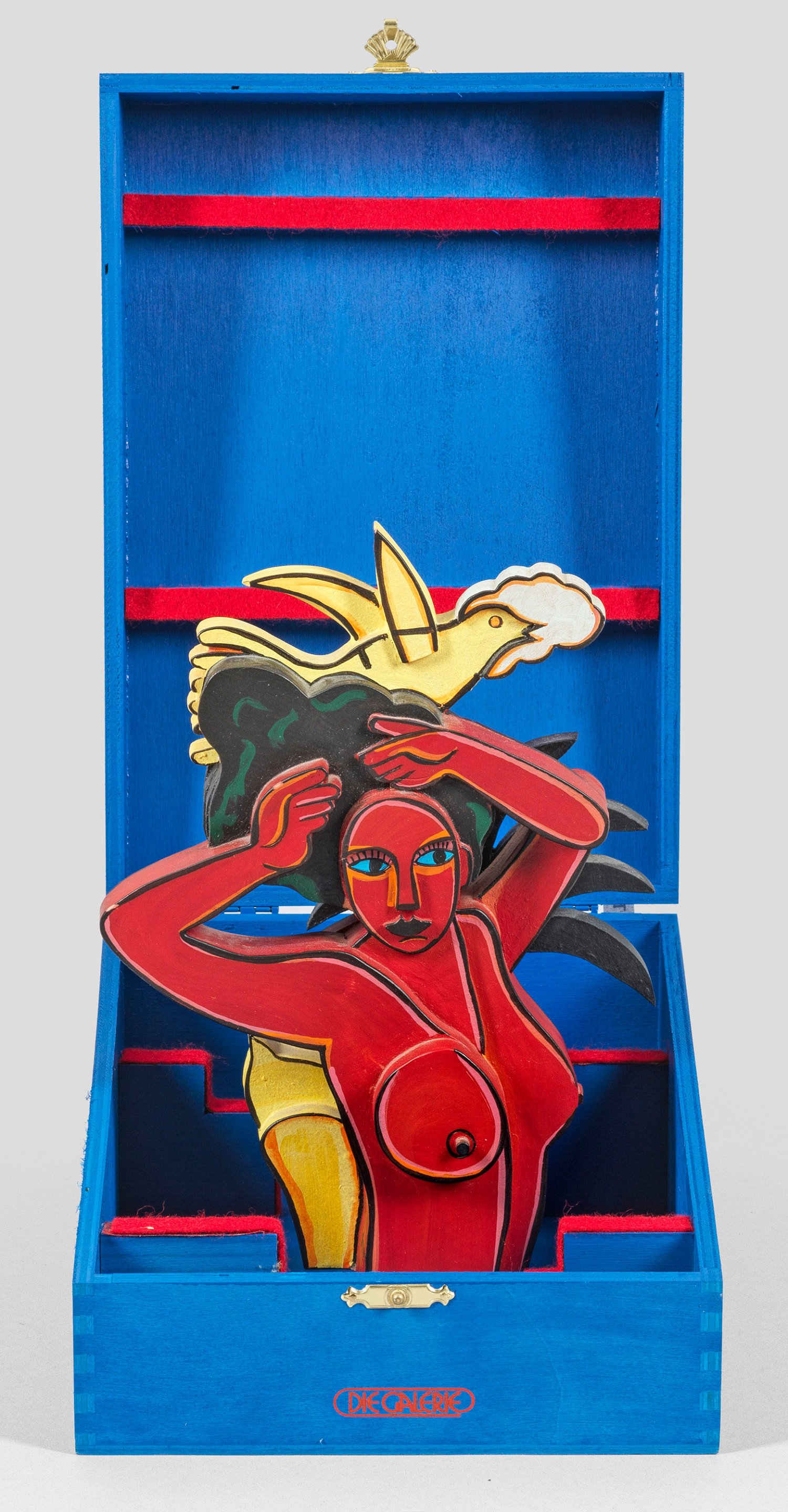 Kunststeinguss, schwarz u. polychrom bemalt, 1999. Multiple. Sign. u. nummeriert 57/999. Gegossen bei Fritz Albrecht, Altrandsberg; Hrsg. "Die Galerie", Frankfurt am Main. Doppelansichtiges, reliefiert geschichtetes Objekt mit weiblichem Akt, Vogel, Palme und Katze. Blau gefasste Original-Holzbox, bez. mit Künstler- und Galerieschriftzug in Rot. Skulpturen-Maße ca. 23,5 cm x 16,5 cm x 8 cm; Holzschatulle ca. 10 cm x 18 cm x 26 cm