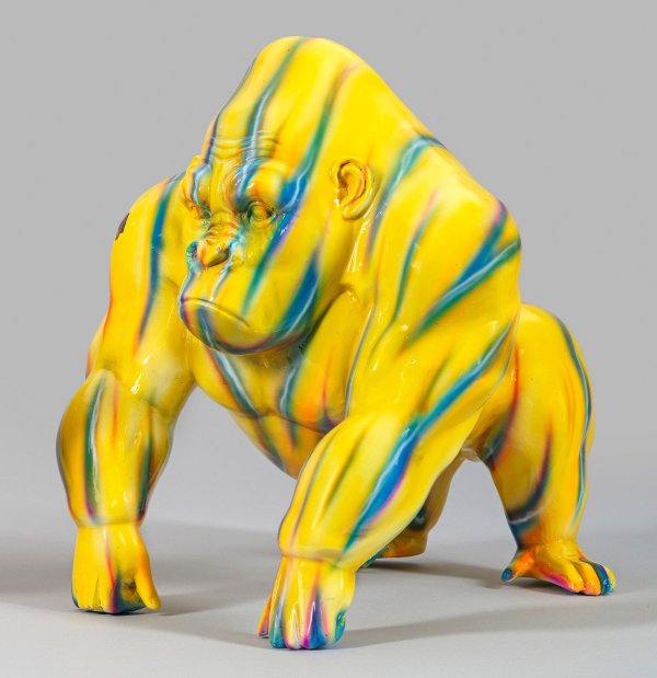 Bronze, polychrom emailliert oder lackiert. Edition der Metropolitan Galleries Inc., High Point, North Carolina, USA. Im Pop-Art-Stil gestaltete Figur eines männlichen Gorillas in Respekt einflößender Pose aus der "ColorSplash Collection" mit intensiv leuchtenden Farben auf gelbem Grund. Minim. rest.; H. 39 cm.
