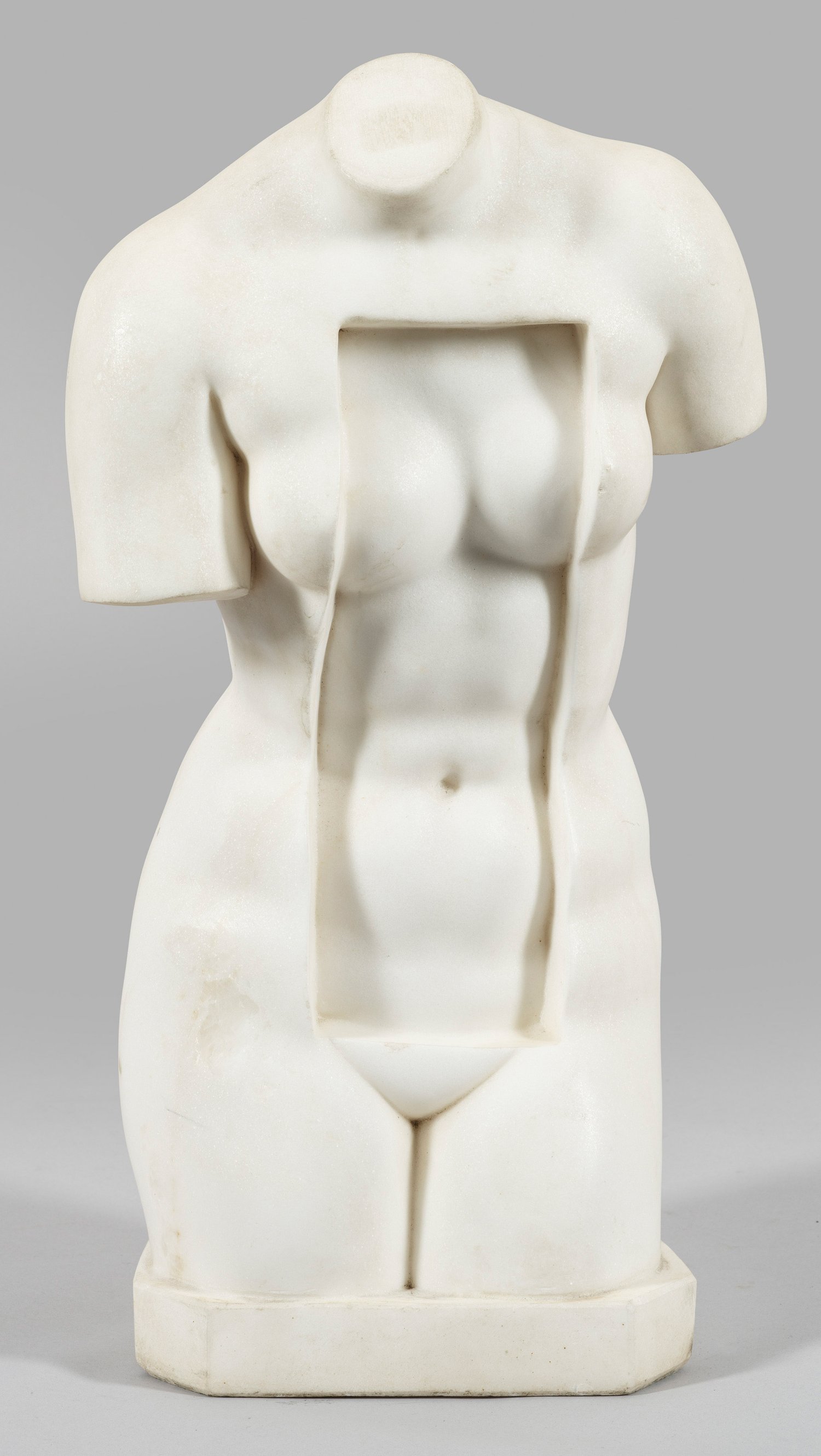 Contemporary sculptor active 20th/21st century. Surrealistic white marble female torso.