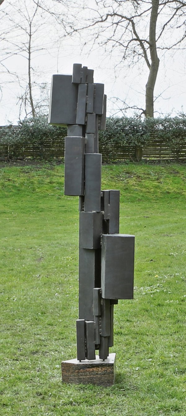 Stahl, geschweift und geschwärzt; Granitsockel. Abstrakte, wohl 1963-1965 geschaffene, für das Oeuvre Becks charakteristische, hohe Stele mit einem Konglomerat unterschiedlicher Quader- und Rechteckstabformen. Die durch ihre zahlreichen Werke im öffentlichen Raum bekannte Bildhauerin studierte 1949-1956 an der Akademie in Stuttgart bei Karl Hils, Peter Otto Heim, Gerhard Gollwitzer und Willi Baumeister. Zudem absolvierte sie seit 1955 eine Feinblechner-Lehre, was ihr bei der Beherrschung von Metall für ihre Skulpturen zugutekam. 1955/56 unternahm Beck Paris-Reisen und stellt dort im Salon "Les Surindépendants" aus, was ihr Kritiken, aber auch eine Verweisung von der Akademie einbrachte. 1962 hat sie ihre erste Einzelausstellung in der Galerie Parnass in Wuppertal-Elberfeld, im selben Jahr gewann sie den zweiten Preis beim 3. Grand Prix International de Sculpture in Monaco, 1967 folgte der Kunstpreis der Böttcherstraße in Bremen, 1989 die Verleihung des Professoren-Titels. Ges.-H. 170 cm.