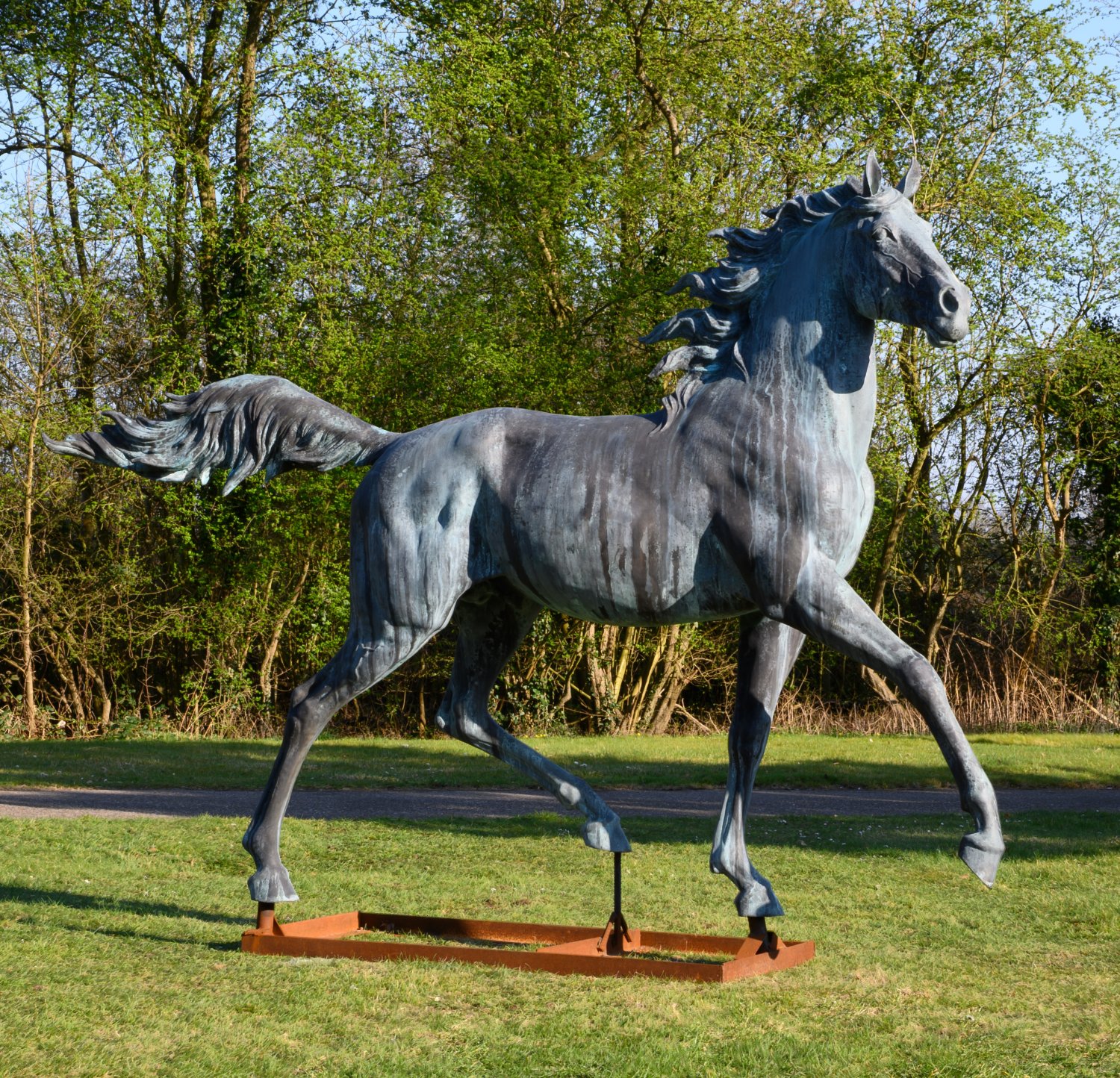 Bronze, in graugrünen und dunklen Tönen patiniert sowie mit gewachsener Patina; Montiert auf einem rechteckigen Stahlgerüst mit Rostpatina. Vollplastische, monumentale, überlebensgroße, lebendig-realistische Darstellung des Pferdes als beeindruckende, repräsentative Park- oder Gartenskulptur. Es zeigt das Pferd im Moment voller Bewegung, dargestellt in einem dynamischen Trab, mit erhobenem rechten Vorderbein und elegant nach hinten ausschwingendem Schweif, was ihm eine lebendige, kraftvolle Ausstrahlung verleiht. Die detailreiche Ausarbeitung des Fells und anatomisch getreue Wiedergabe des Körperbaus und der Muskulatur lässt die Figur noch realistischer wirken. Besonders auffällig ist die wehende Mähne, die die Bewegung zusätzlich unterstreicht. Bronze-H. 215 cm, L. ca. 293 cm; Stahlsockel ca. 16,5 cm x 157 cm x 77 cm.