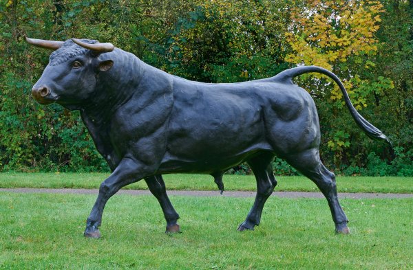 Bronze, dunkel patiniert, partiell poliert und goldbraun patiniert. Monumentale, lebensgroße, naturnahe, anatomisch getreue Darstellung eines laufenden Stieres mit erhobenem Kopf, das die schier ungebändigte Kraft des Tieres eindrucksvoll wiedergibt. Die teilw. fein ausgearbeiteten Details des Bullen und die zweifarbige Patinierung verstärken die Lebendigkeit. H. ca. 156,5 cm; L. ca. 320 cm.
