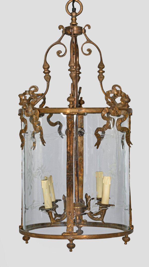 4-flg.; Bronze, patiniert und farbloses Glas. Zylinderförmiger Korpus aus schmalen Streben und Stegen mit großen Schleifendekorationen sowie geschweift ansteigendem oberen Abschluss aus teilw. eingerollten Voluten. Innen schlanker Schaft mit blattreliefierten Leuchterarmen als Träger für Leuchtmittel. Lampen-H. 84 cm. D. 43 cm.