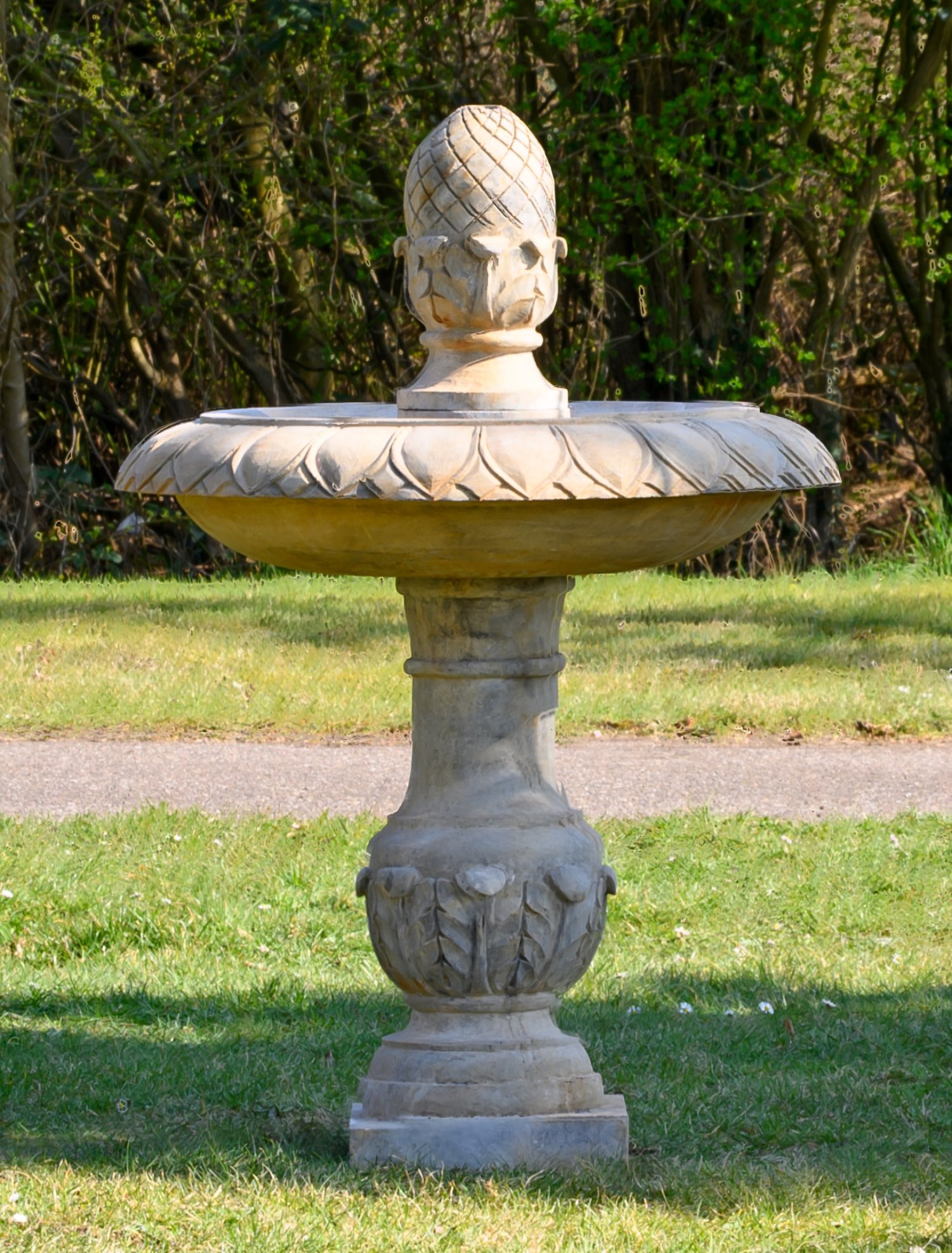 Beigefarbener, blaugrau gemaserter Kalkstein. Über quadratischer Plinthe mehrfach gegliederter Balusterschaft, umlaufend mit breitem Fries aus Akanthusblatt als Träger für gemuldete Brunnenschale mit breitem Lippenrand. Oberer Abschluss in Form eines großen Zapfens als Wasserspeier. H. 125 cm.