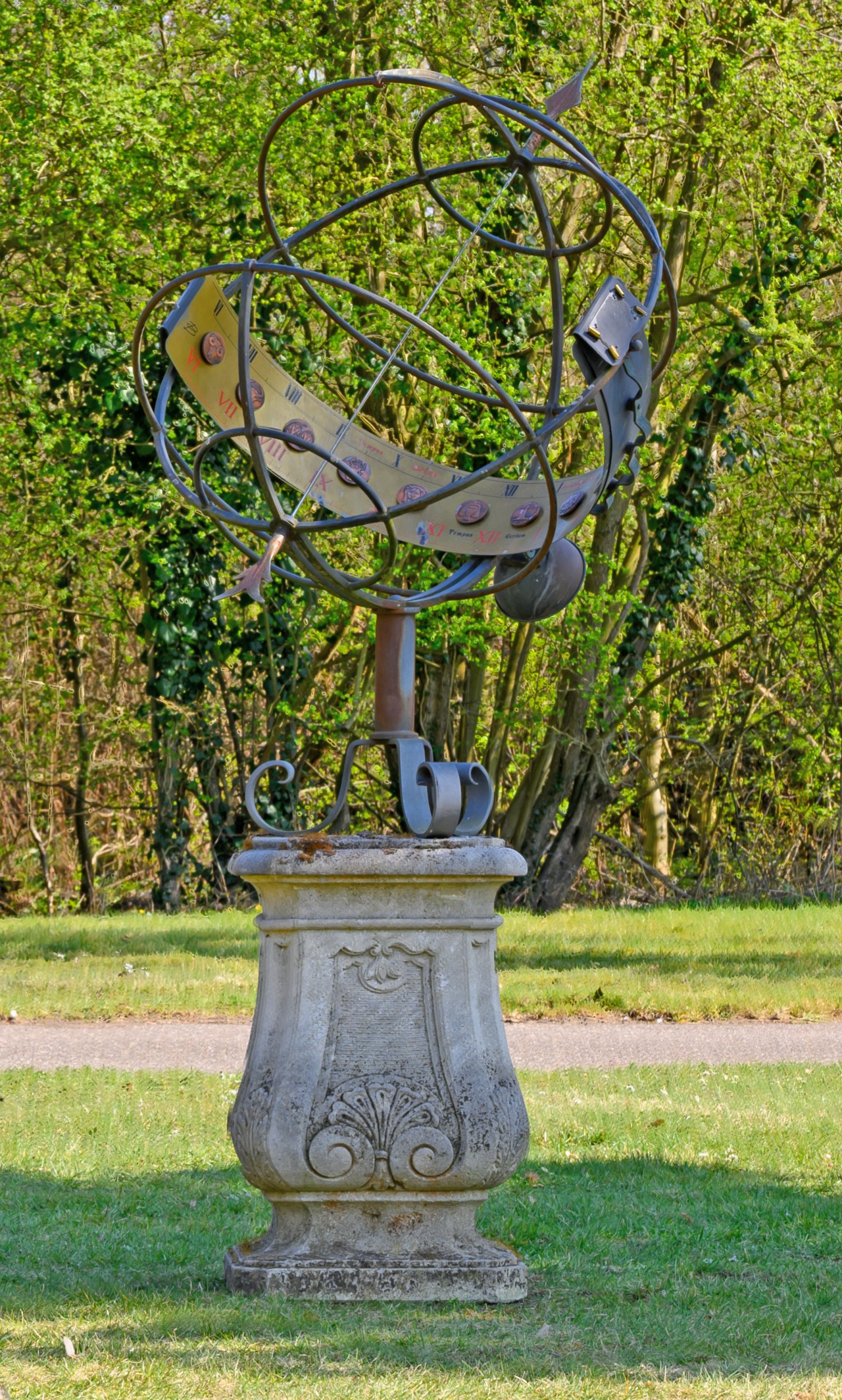 Sandsteinguss und Eisen. Balusterförmiger Sockel mit schräggestellten, blattreliefierten Ecklisenen sowie großen Reserven aus eingerollten Voluten und Muschelwerk. Oberhalb davon ausgehend große Sonnenuhr aus gebogten Stegen und pfeilförmigem Ausrichter. Breite Skala aus römischen Zahlen sowie applizierten Tierkreiszeichen. Ges.-H. 234 cm.