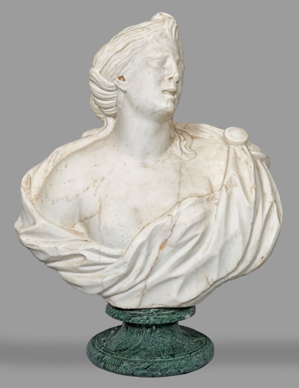 Weißer Mamor, die Plinthe aus grünem Marmor. Vollplastische, rücks. abgeflachte und am Körper leicht gehöhlte Darstellung mit Meißelspuren. Barocke Darstellung mit stark nach links gewandtem, expressiv dargestelltem Kopf, der Mantel auf der linken Seite in antiker Weise mit einer Gewandfibel geschlossen. Ges.-H. ca. 65 cm.