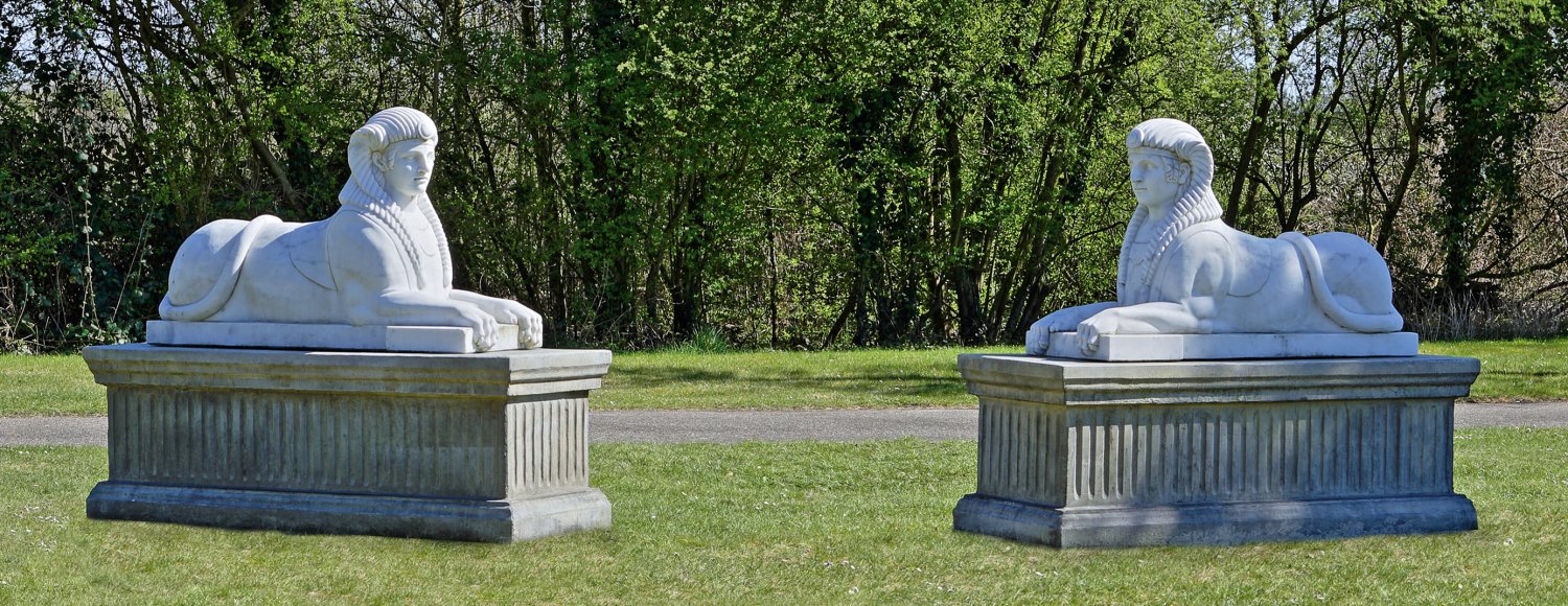 Gegenstücke. Weißer, leicht hellgrau geäderter Marmor. Repräsentative, neoklassizistische Park- bzw. Gartenskulpturen. Auf rechteckigen, vorne abgesetzten Plinthen ruhende, vollplastisch ausgeführte Sphingen mit subtiler Oberflächenbehandlung. Die weiblichen Köpfe mit langen, geflochtenen Zöpfen und Kopfschmuck, der Körper und der Schweif in Löwenform. Rechteckige, hellgraue Guss-Steinsockel mit abgesetzter Basis und Deckplatte, sowie kannelierten Seiten. Sphingen ca. 89 cm x 150 cm x 54 cm; Sockel ca. 68 cm x 190 cm x 71 cm.