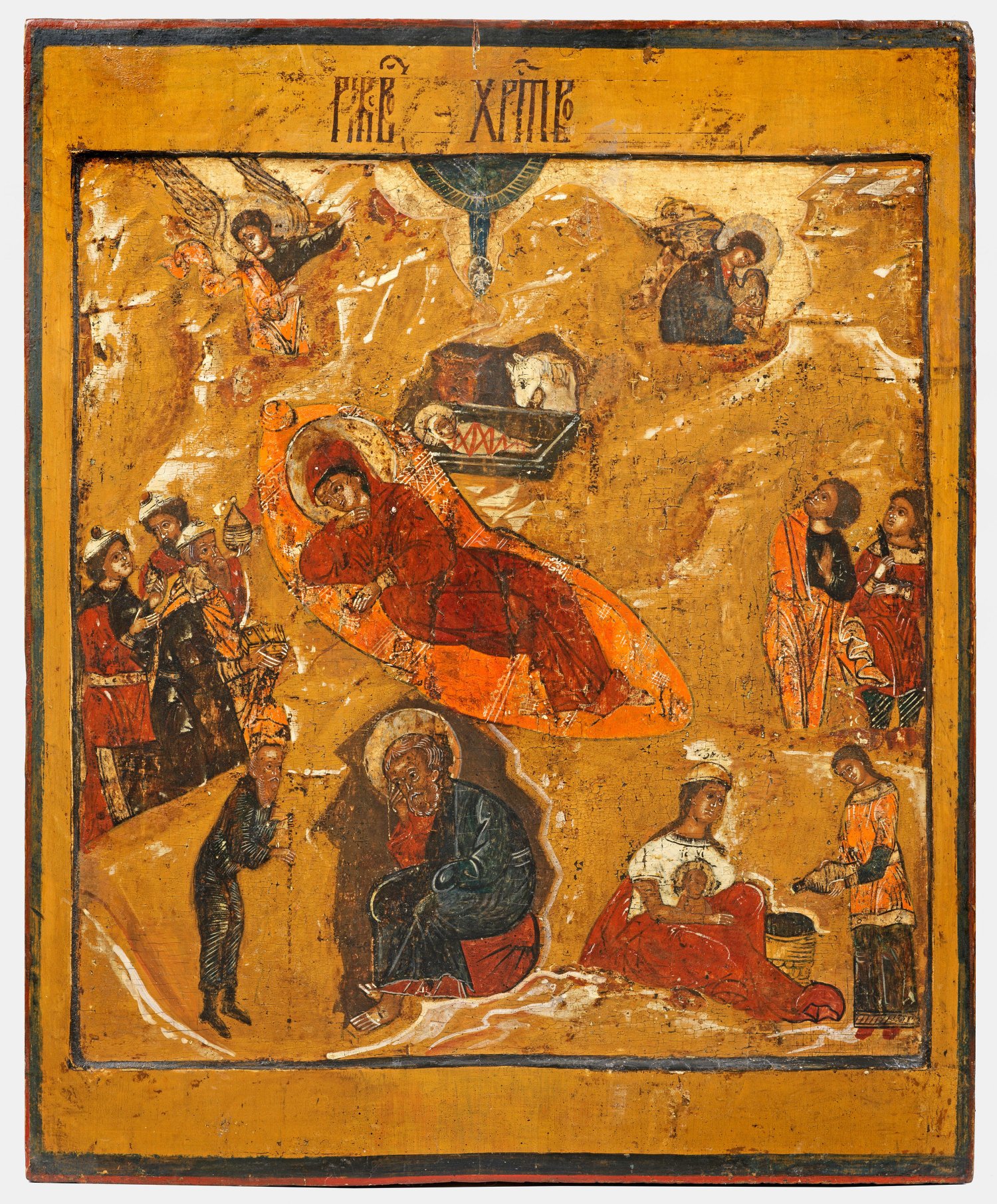 Tempera mit Goldgrund auf Holz. Zwei rücks. Sponki. In der Bildmitte die ruhende Gottesmutter mit dem von Ochs und Esel beäugten Jesuskind in der Krippe. Auf Goldgrund umgebend weitere Darbietungen zur Geburt Christi - die heiligen drei Könige, der Teufel als Hirte dem heiligen Josef in Erscheinung tretend, um die Lehre der Jungfrauengeburt zu verkünden. Die Hebamme und die Magd, das Neugeborene Jesuskind waschend sowie die Verkündigung der Hirten. Kirchenslawisch bez. "Geburt Christi". Zertifikat. Minim. best./rest.; 55 cm x 44 cm x 3 cm.