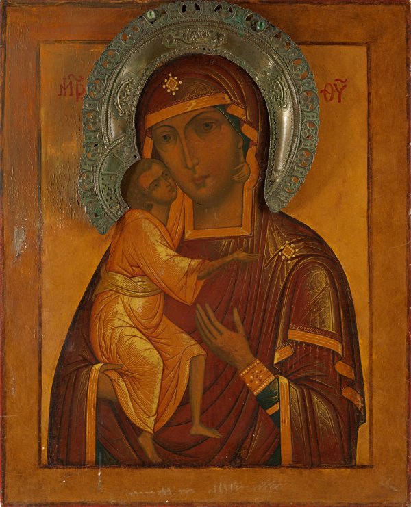 Tempera mit Gold auf Holz. Aufgesetzte, vergoldete Nimben mit grünen Farbsteinen. Zwei rücks. Sponki. Die Gottesmutter das Christuskind mit der linken Hand haltend, mit der rechten auf dieses deutend. Die vermeintliche Grenze der Bildfläche, der umlaufende, dunklere Rand, wird von den darüber hinausragenden Nimben von Mutter und Kind durchbrochen. Kirchenslawisch bez.; Zertifikat. 71,5 cm x 57,5 cm x 5,5 cm.
