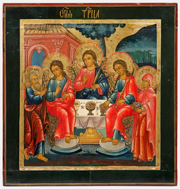 Tempera mit Goldgrund auf Holz. Drei Engel an einem gedeckten Tisch sitzend, links von Abraham, rechts von Sara flankiert. Im Hintergrund linksseitig das Haus Abrahams, mittig die Eiche von Mamre. Kirchenslawisch bez. "Die hl. Dreifaltigkeit". Zertifikat. 54 cm x 52 cm x 2,5 cm.
