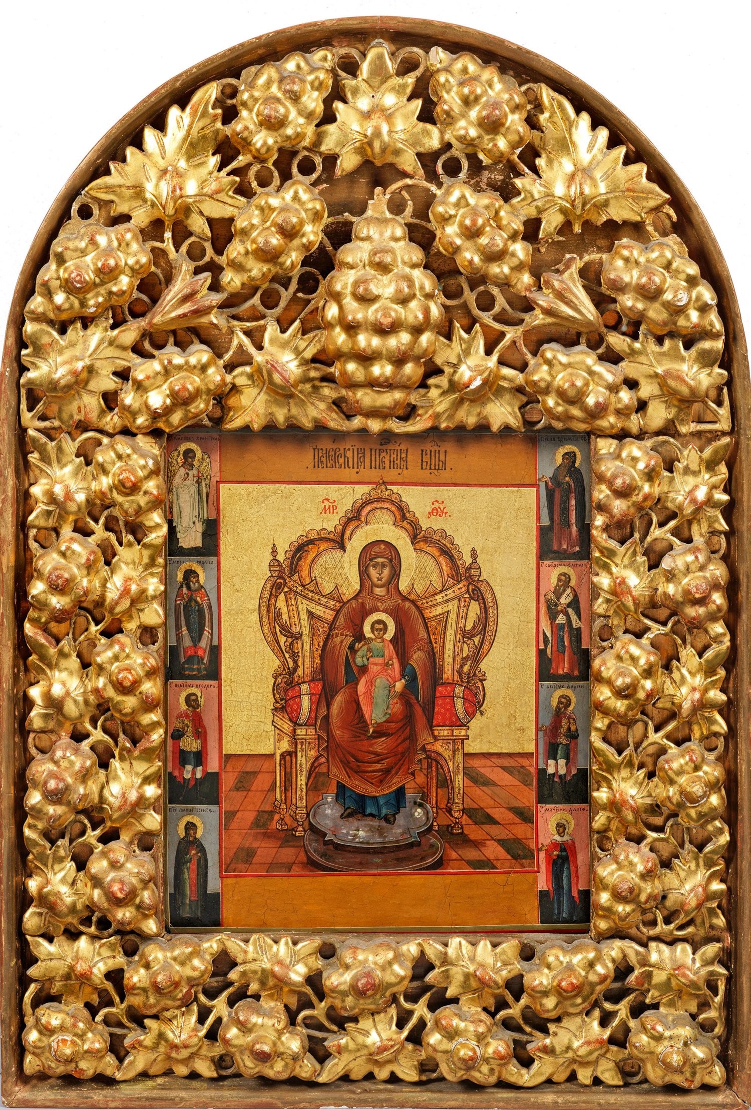 Tempera und Gold auf Holz. Im perspektivisch angelegtem Mittelfeld thront die Gottesmutter auf einem opulenten Thron mit rotem Kissen und hält den segnenden Christusknaben auf ihrem Schoß. Flankiert werden die beiden von acht Randheiligen, darunter der Erzengel Michael. 35 cm x 30,5 cm x 3 cm. Vergoldete, aufwendig in Ajour geschnitzte Holzrahmung mit plastischem Weinrebendekor, ca. 73 cm x 51 cm.