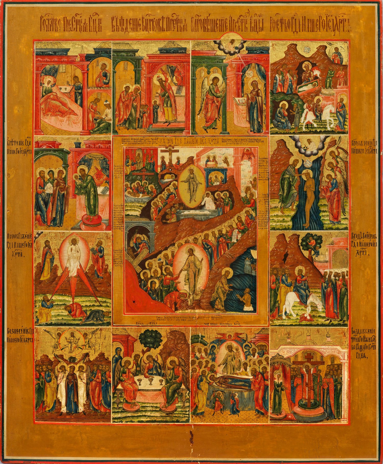A very large Russian icon showing the descent to hell, the resurrection and twelve major lithurgical feasts. Tempera with gold on wood.
