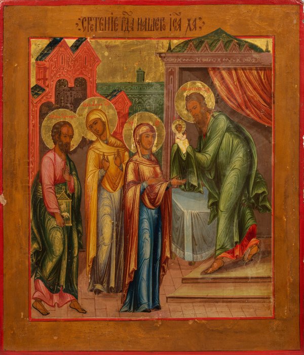 Tempera mit Gold auf Holz. Vor stilisierter Architekturkulisse reicht der Hl. Simeon, der erhöht vor einer tempelartigen Pagode mit Altar steht, den Christusknaben ehrfürchtig zurück an Maria, die ihren Sohn mit ausgestreckten Armen in Empfang nimmt. Begleitet wird Maria von Joseph und der Prophetin Hanna. Kirchenslawisch bez. und betitelt; 40 cm x 35 cm x 2,5 cm.