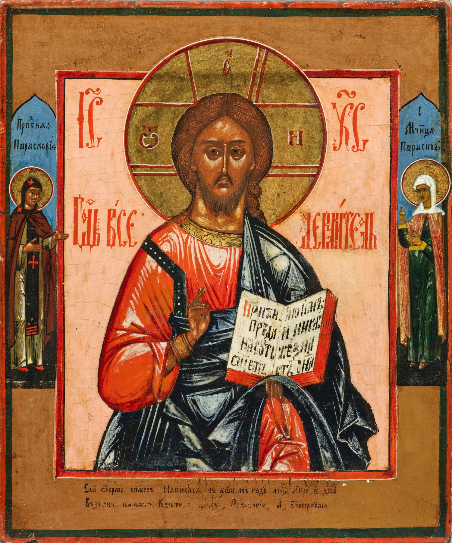 Tempera und Gold auf Holz. Kowtscheg. 2 rücks. Sponki. Halbfigurige Darstellung Christi als Weltenherrscher mit geöffnetem Evangelium, die rechte Hand zum Segensgestus erhoben. Flankiert von zwei Randheiligen. Kirchenslawisch bez.; 29 cm x 24 cm x 2 cm.