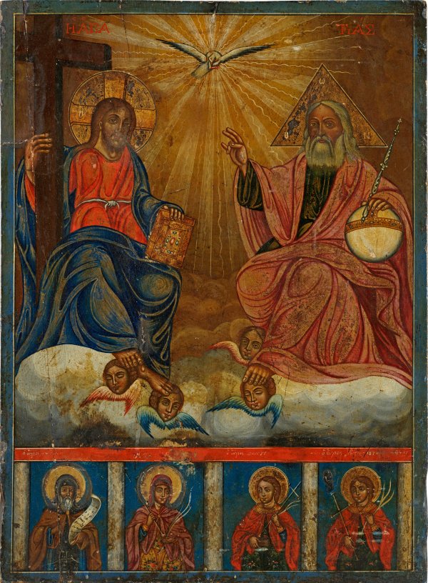 Tempera mit Gold auf Holz. Zwei rücks. Sponki. Im oberen Bild Christus mit Kreuz und Evangelium sowie Gottvater mit Weltkugel und Zepter rechts auf Wolken, im Licht des durch eine Taube verkörperten Heiligen Geistes thronend. Zu ihren Füßen Engelsköpfe. Im unteren Bild die Darstellung vierer Heiliger, darunter der Hl. Antonius und der Hl. Pantelejmon. Griechisch bez.; dat.; Zertifikat. 57 cm x 42 cm x 2 cm.
