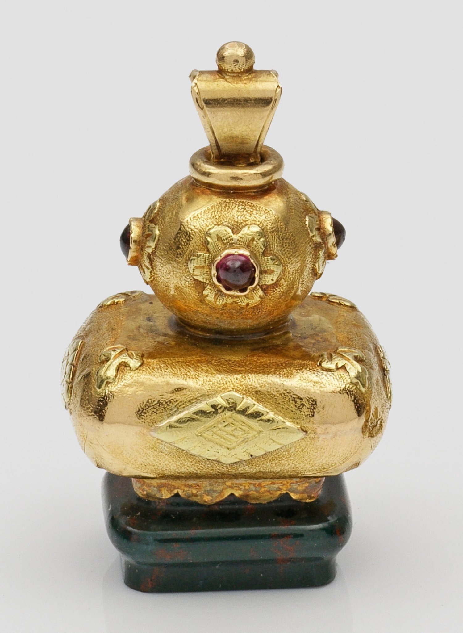 Gelbgold, 14 ct. und Blutjaspis. Balusterförmiger Anhänger bestehend aus einem rechteckigen Nodus mit gerundeten Ecken und Kanten und einem Kugelnodus, besetzt mit kleinen, blütenförmig gefassten Granatcabochons. Stempelfläche mit Wappenschild, bekrönt von alter Grafenkrone und gerahmt von Rosenranken. Minim. best.; Gew. ca. 15 g. H. 3,5 cm. Stempelfläche 1 cm x 1,2 cm.
