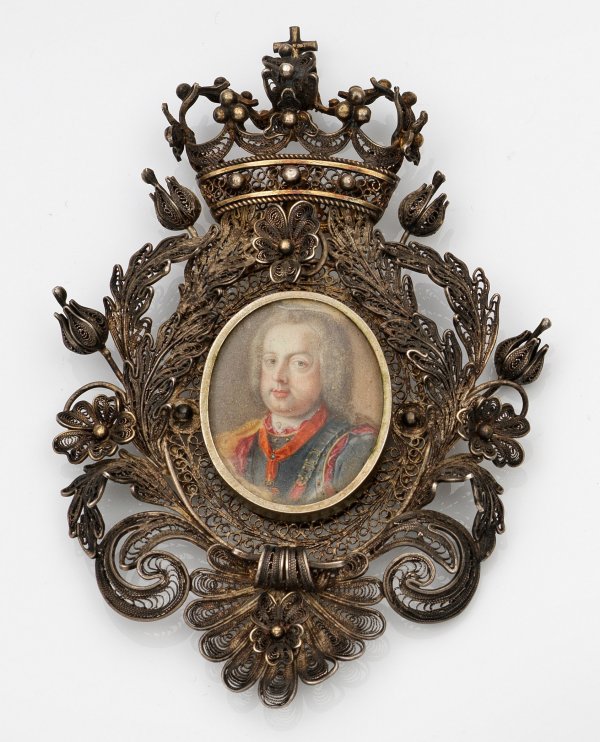 Brustbildnis des Kaisers mit Kürass. Um den Hals den Orden vom Goldenen Vlies an breitem, rotem Band. Tempera/ Elfenbein. Minim. ber.; 3,1 cm x 2,5 cm. Aufwendig gestalteter, durchbrochen gearbeiteter und bekrönter Filigranrahmen aus Silber mit reliefplastischem Blatt-, Blüten und Volutendekor.