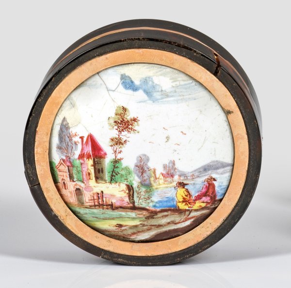 Schildpatt mit Goldmontierung. Runder, zylindrischer Korpus. Zentral im Deckel gefasste Plakette mit architektur- und baumbestandener Seelandschaft und Figurenstaffage in polychromer Emaillemalerei. Besch. und teilw. rep.; H. 3 cm. D. 7,5 cm.