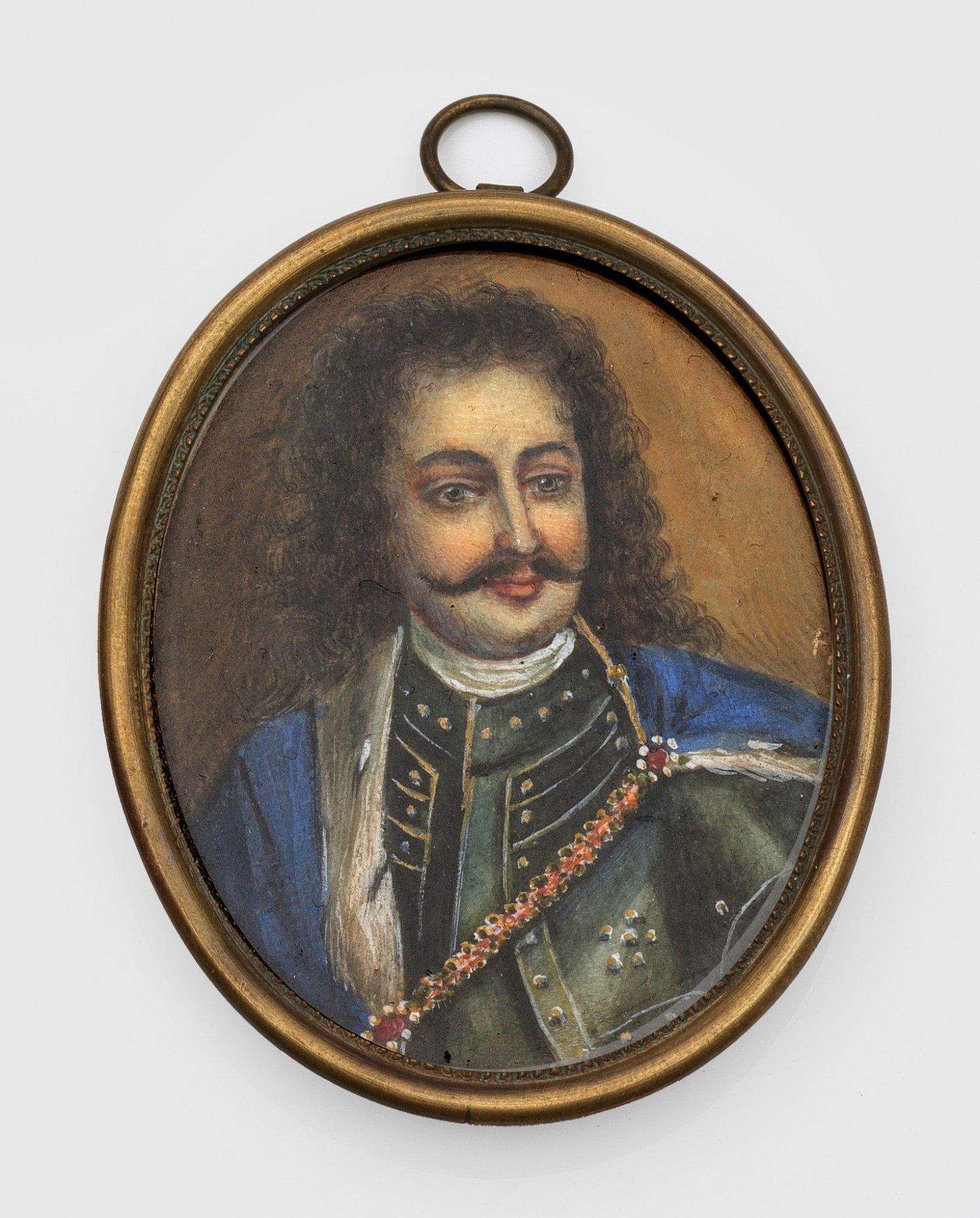 Ovales Brustbildnis des ungarischen Freiheitskämpfers mit Harnisch und pelzbesetztem Umhang. Nach Vorlage des Kupferstich-Frontispiz in den 1739 erschienenen Memoiren von Franz Rákóczi "Histoire Des Revolutions De Hongrie". Tempera/Pergament. R. m. monogr. "FA" (?); Verso auf lederbezogener Rückwand teilw. undeutl. handschriftlich bez. "...Siebenbürgische..." sowie kleines Etikett "Franz Rakaczy". 5,5 cm x 7 cm. Messingrahmen mit Aufhängeöse.