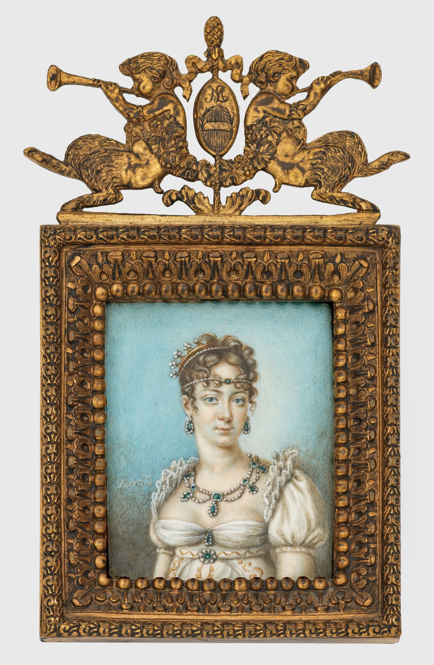Brustbildnis der Kaiserin mit tief dekolletiertem, weißem Kleid, Puffärmeln und gerüschtem Stehkragen. Auf den gelockten Haaren eine Krone sowie ein Perl-Stirnband; um den Hals ein üppiges Collier mit Smaragden und Diamanten. L. u. sign.; Rahmen verso graviert bez. "Marie Luise Imperatrice dei Francesi e Regina d'Italia. Arch. Austr.". 6,5 cm x 8,3 cm. Originaler Messingrahmen, bekrönt von zwei Satyrn mit graviertem Monogramm "ML".