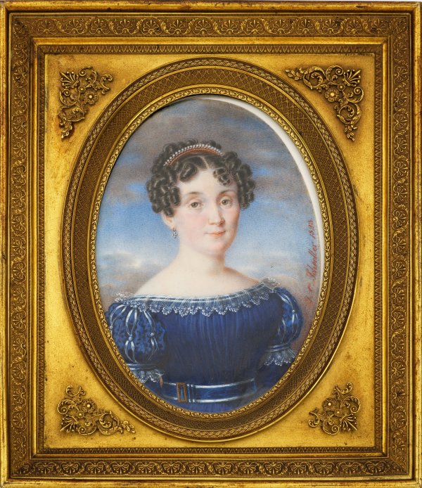 Ovales Bildnis einer Dame in marineblauem Kleid mit zarter Spitze und Gürtel. Das dunkelbraune, gelockte Haar bekrönt von einer Tiara besetzt mit Perlen. R. sign. und dat. "1823"; verso alte Etiketten mit Sammlungs- bzw. Inventarr-Nr. u. a. "E1840". Tempera/Elfenbein. 8,5 cm x 12 cm. Üppig verzierter, vergoldeter Messingrahmen mit Hängeöse.