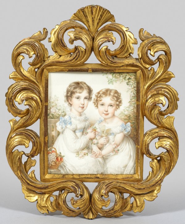 Biedermeierliches, fein gemaltes und feinfühliges Bildnis von zwei Kindern mit Rosenkränzen, kleinem Vogel auf der Hand und Obstkorb auf einer Bank sitzend. Gekleidet in weißen Spitzenkleidern mit hellblauen Schleifen an den Schultern. L. u. sign. "Jean Ender Roma", verso zwei kleine Etiketten mit Sammlungs- bzw. Inv.-Nr. "E574" sowie auf späterem Etikett handschriftlich bez. "Hon. Fanny Stuart, Hon. Catherine Stuart by Johann Nepomuk Ender". Altes Firmenetikett des Rahmenherstellers "Zerboni, Battistessa, Moteni & Guanziroli" in Edinburgh. Aquarell und Bleistift auf Karton. 14,5 cm x 17,2 cm. Vergoldeter, volutierter Rahmen.