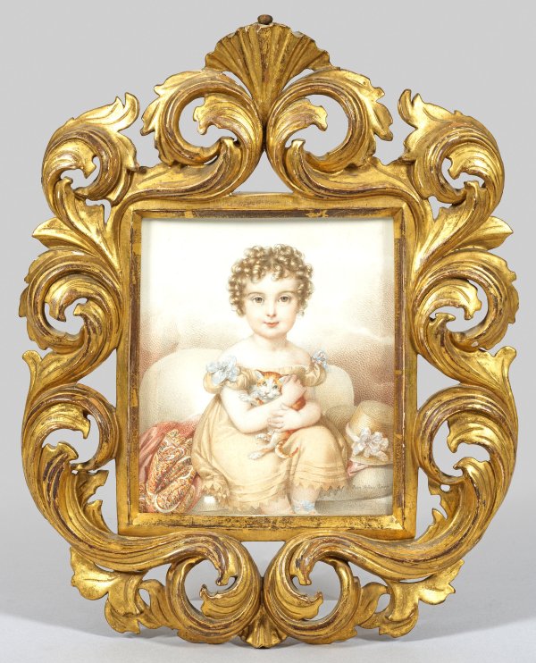 Biedermeierliches, fein gemaltes und feinfühliges Bildnis eines sitzenden Kindes mit rotgetigerter Katze auf dem Schoß. Neben sich einen Strohhut mit großer Schleife liegend. Gekleidet in beigefarbenem Kleid mit hellblauen Schleifen an den Schultern. R. u. sign. mit Ortsangabe "Jean Ender Rome", verso zwei kleine Etiketten mit Sammlungs- bzw. Inv.-Nr. "E573" sowie auf späterem Etikett handschriftlich bez. "The Honorable Chester Stuart aged 3 year painted 1821 in Rome". Altes Firmenetikett des Rahmenherstellers "Zerboni, Battistessa, Moteni & Guanziroli" in Edinburgh. Aquarell und Bleistift auf Karton. 14,5 cm x 17 cm. Vergoldeter, volutierter Rahmen.