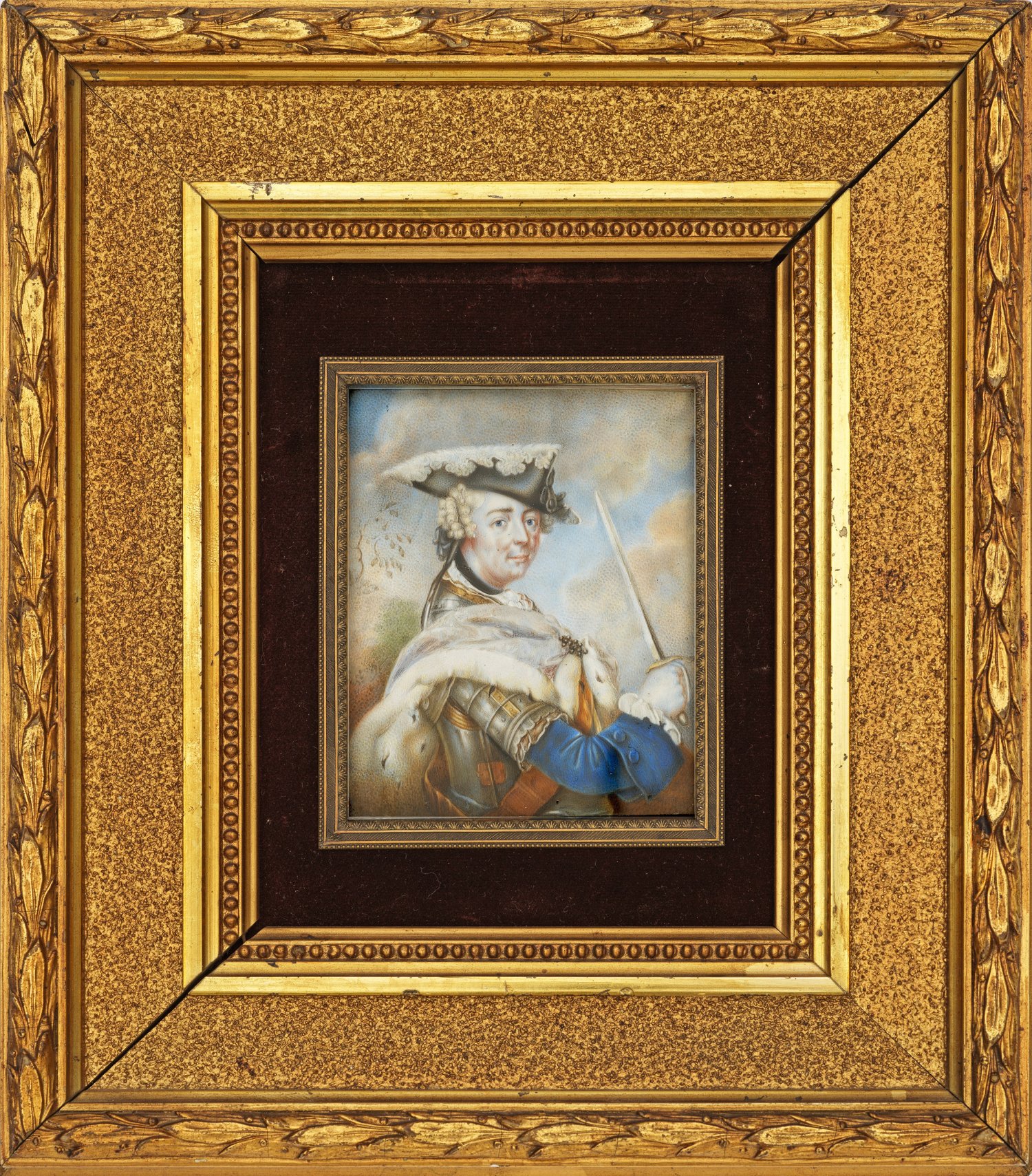 Hüftbildnis des preußischen Königs im Halbprofil mit Dreispitz, Harnisch und blauem Untergewand. Über der Schulter ein weißer, hermelinbesetzter Umhang. In der erhobenen Hand ein verkürzt dargestellter Degen. Baumbestandener Hintergrund. Später verso bez.; Tempera/Elfenbein. 7 cm x 9 cm. Rahmen.