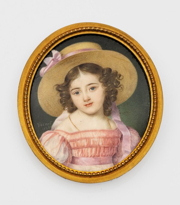 Ovales Bildnis. Strohhut mit breiter Krempe und großer, hellrosa farbener Schleife. Passend dazu ein hochgeschnürtes rosafarbenes Kleid mit Puffärmeln. Neutraler, grünlicher Hintergrund. Minim. Haarriss. L. u. sign. und dat. "Vernet 1826", verso zwei kleine Etiketten mit Sammlungs- bzw. Inventar-Nr. u. a. "E263" sowie auf späterem Etikett handschriftlich bez.; Tempera/Elfenbein. 5,7 cm x 7 cm. Feiner, perlverzierter und vergoldeter Messingrahmen.