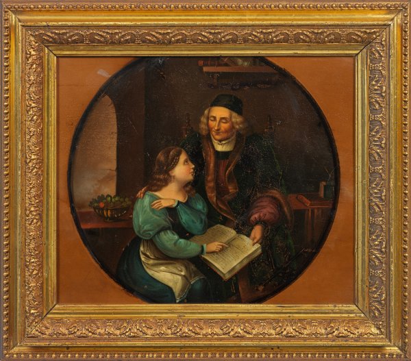 Weißblech. Querrechteckig mit rundem Bildausschnitt. Szenische Darstellung eines Mädchens und ihres Lehrmeisters beim Lesen in einem Buch. Der Mann gekleidet mit pelzbesetztem, dunkelgrünem Mantel und schwarzer Kappe. Im Hintergrund weitere Bücher und eine Obstschale. Rahmen. 35,5 cm x 28,5 cm.