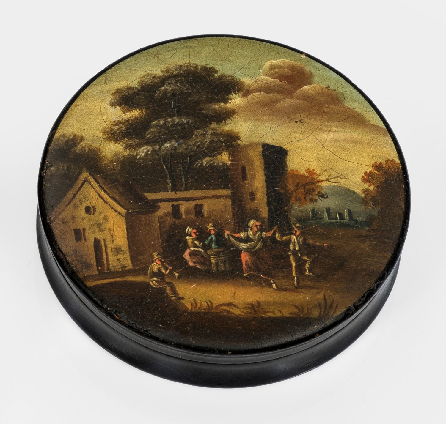 Pappmaché, schwarz lackiert. Runde Dose mit gering eingezogener Wandung. Der Deckel mit architekturbestandener Landschaftsdarstellung mit musizierender und tanzender Gesellschaft. Polychrome Lackmalerei. Krakelee und minim. best.; H. 1,8 cm. D. 8,5 cm.
