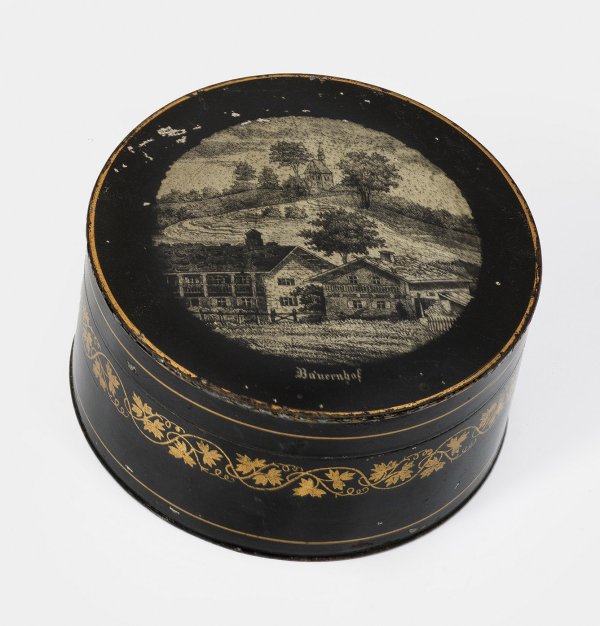 Weißblech, schwarz lackiert. Auf scharniertem Deckel die Darstellung einer süddeutschen oder alpenländischen Landschaft mit Bauernhof und Kirche. Bez. "Bauernhof". Die Wandung umzogen von goldener Weinblattranke. Ber.; H. 6,8 cm. D. 12,7 cm.