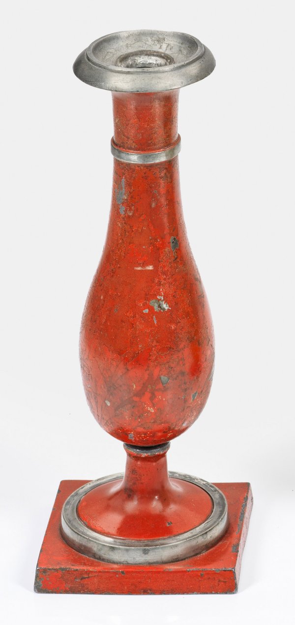Zinn, rot lackiert. Quadratische Plinthe und runder Fuß, übergehend in stark gebauchten, sich nach oben hin verjüngendem Schaft. Herausnehmbare Tülle mit ausgestellter Traufschale. Korpus mit Zinnringen akzentuiert. Ber. und best.; H. 21,4 cm.