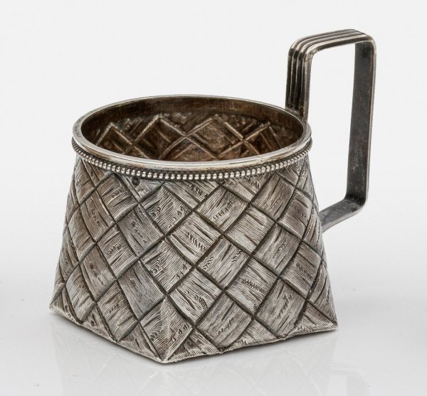sog. Tscharka. Silber. Über quadratischem, flachem Stand konischer Korpus in Form eines Korbes. Die Wandung flächendeckend verziert mit breitem, reliefiertem Flechtdekor. Hoch aufsteigender, gekanteter Henkel. Innen vergoldet. Gest. 84 bzw. 875, Meister Gregroij Andreij Arsenjew (tätig um 1885), Importmarke Estland. Gew. ca. 25 g. H. 3,8 cm.