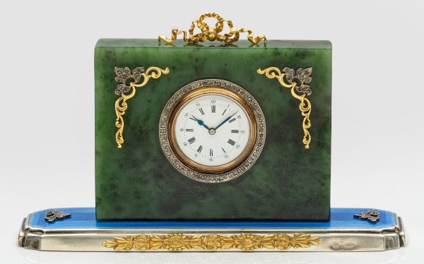 im Stil von Karl Fabergé. Silber, teilw. vergoldet/emailliert und Nephrit. Auf profiliertem, oberseitig emailliertem Sockel eine aufrechtstehende, rechteckige Nephritplatte, mit zentral eingelassener Uhr. Von einem Ring in Silber gefasste Diamantrosen gesäumte, vergoldete Lünette und weißes Zifferblatt mit schwarzen, römischen Zahlen sowie arabischen Minutenzahlen. Sockel und Nephritplatte belegt mit durchbrochen gearbeiteten, teils vergoldeten oder mit Diamantrosen besetzten Silberapplikationen in Form von stilisiertem Blattwerk, Schleifen, Blüten und Voluten. Rücks. Aufzug. Mit Schlüssel. Gest. 88. H. 9,5 cm. 16 cm x 4 cm.