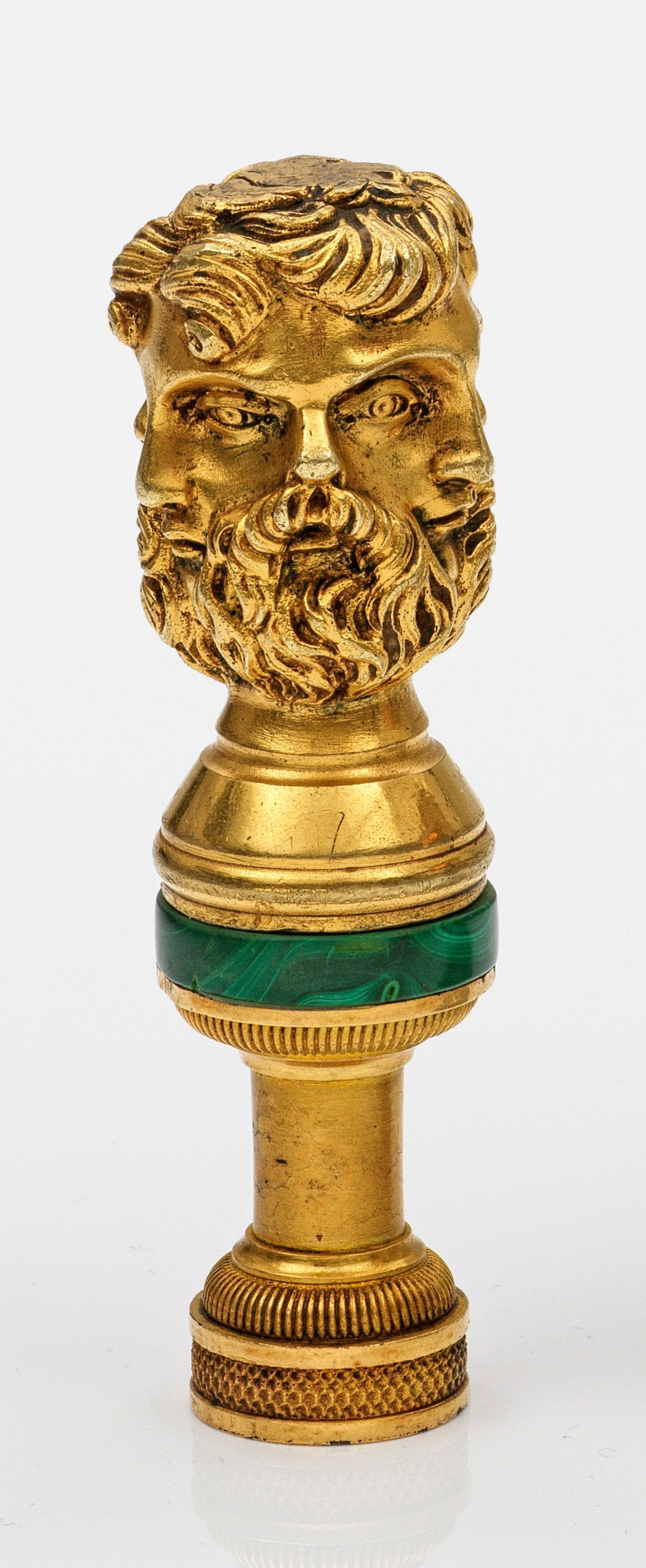 Bronze, vergoldet. Balusterförmiger Korpus mittig mit eingesetztem, schmalem Malachitring verziert. Griff bestehend aus sechs ineinandergreifenden, antikisierten weiblichen und bärtigen, männlichen Gesichtern. Stempelfläche fehlt. H. 10,3 cm.