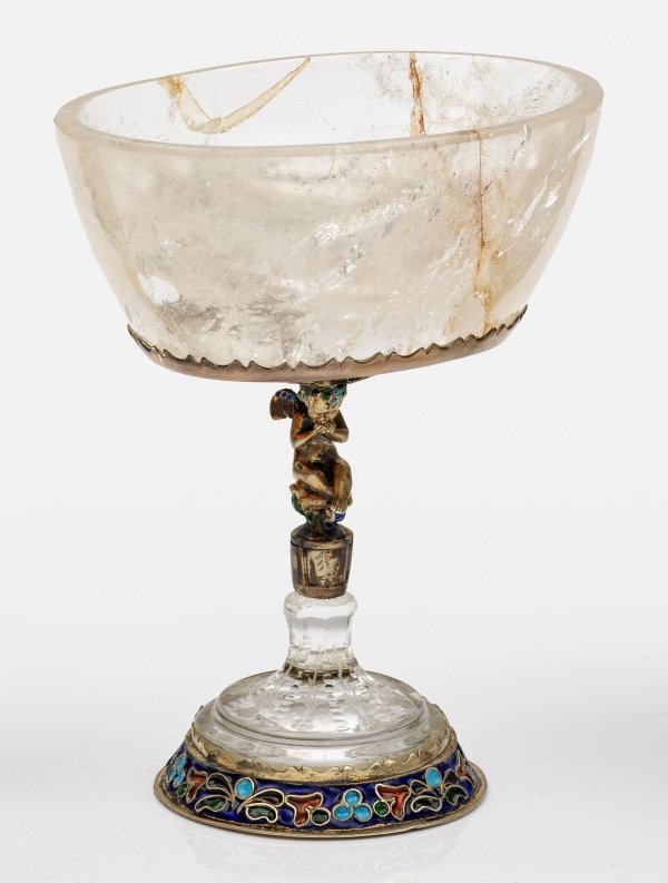 Silber, vergoldet und emailliert, Bergkristall und Glas. Trompetenförmiger Stand aus geschliffenem Glas, mit polychromem Cloisonnéband umzogen, übergehend in kurzen Schaft. Nodus in Gestalt eines vollplastischen Puttos, als Träger für konische Kuppa aus Bergkristall, rep.; H. 12 cm. 10 cm x 7,5 cm.