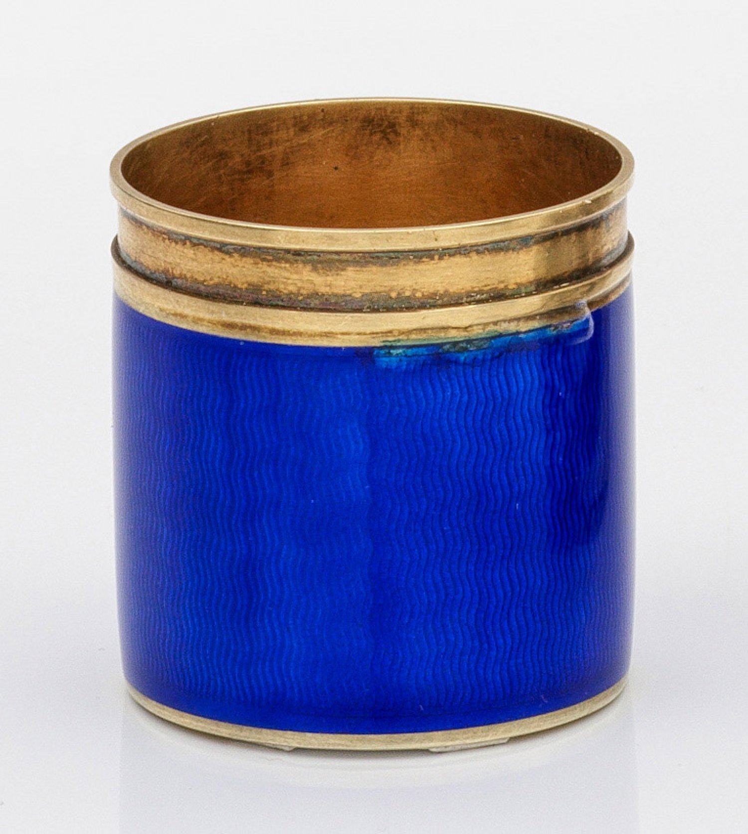 Silber, vergoldet/emailliert. Zylinderförmiger Korpus mit profiliertem Rand. Wandung flächendeckend wellenförmig guillochiert und mit royalblauem Fond emailliert. Kleine Fehlstellen. Gest. 88, Beschauzeichen. Gew. ca. 20 g. H. 3,3 cm.