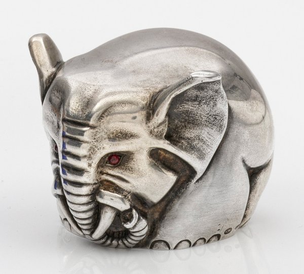 Silber. Vollplastisch in Form eines rundlichen Elefanten mit abgeflachtem Rücken, gering ausgestellten Ohren und roten Granatcabochons als Augen. Innen vergoldet. Gest. 88. Gew. 150 g. H. 4,3 cm.