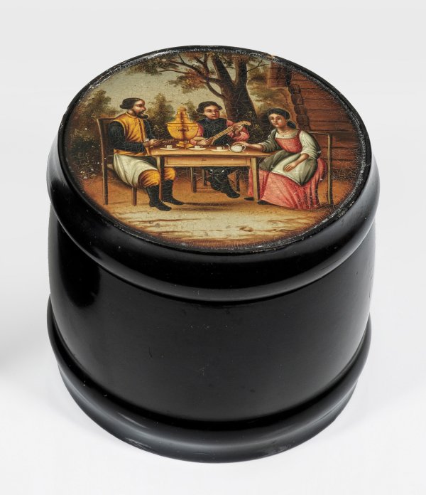Pappmaché, schwarz lackiert. Hoher, fassförmiger Korpus. Auf dem Steckdeckel baumbestandene Landschaft mit zwei Männern und einer Frau beim Teetrinken und Musizieren. Polychrome Lackmalerei. Innen mit Zinnfolie ausgeschlagen. Teilw. undeutl. Herstellerzeichen. H. 10,5 cm. D. 11,5 cm.