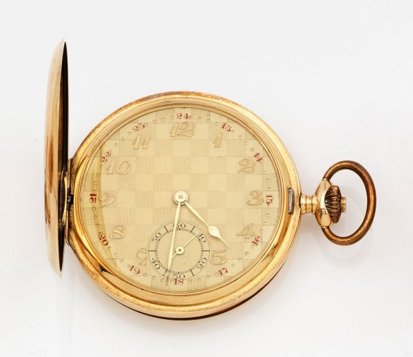 A hunting case pocket watch, Switzerland, circa 1920. Case in 14 k gold. Dome in metal. Mechanical movement with crown wind.