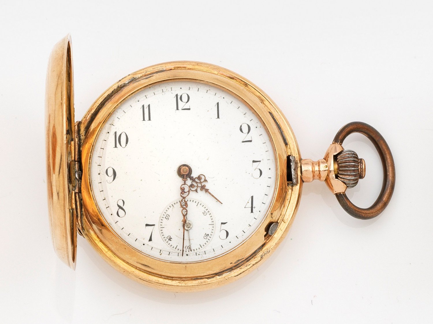 A hunting case pocket watch, Glashütte, circa 1900/1920. Case in 14 k red gold. Dome in metal. Mechanical movement with crown wind.