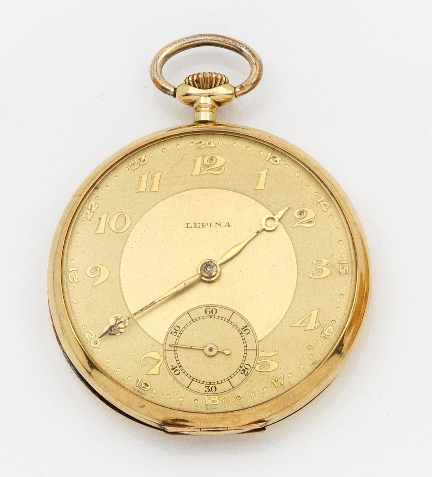 An halfopen face pocket watch by Lepina, circa 1920/1930. Case in 14 k gold. Dome in metal. Mechanical movement with crown wind. Signs of use.